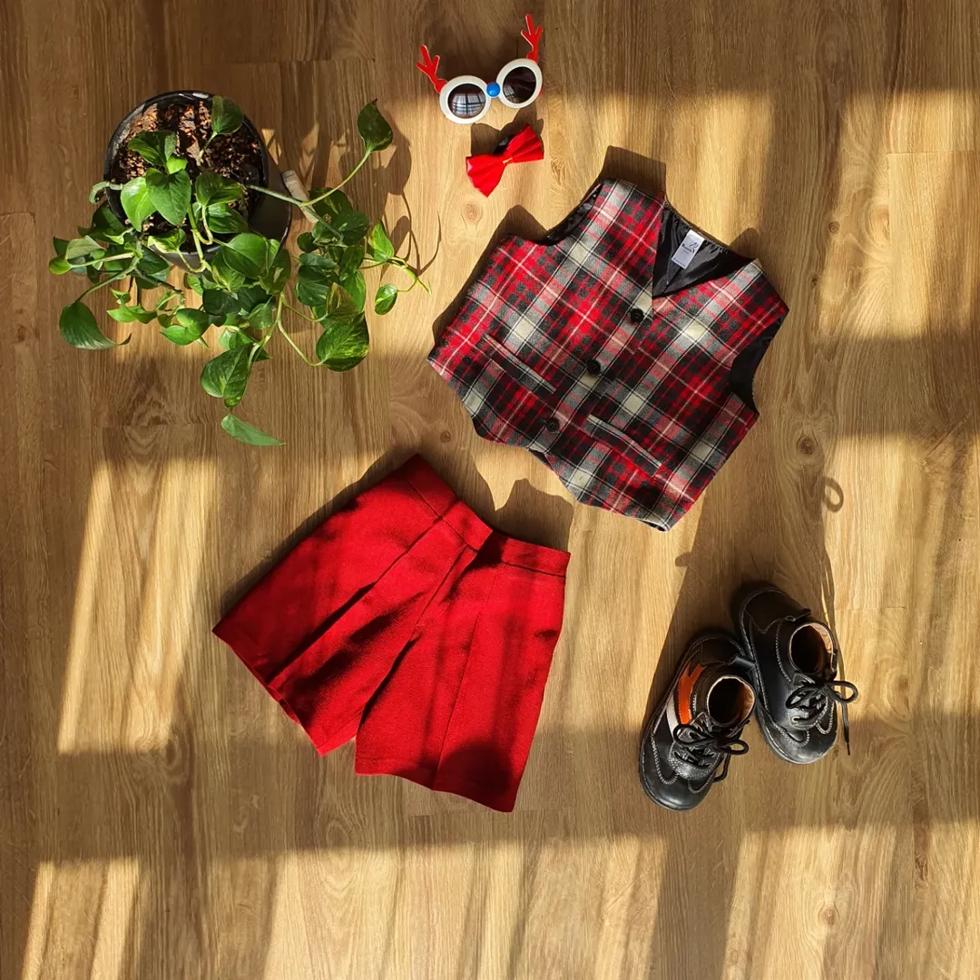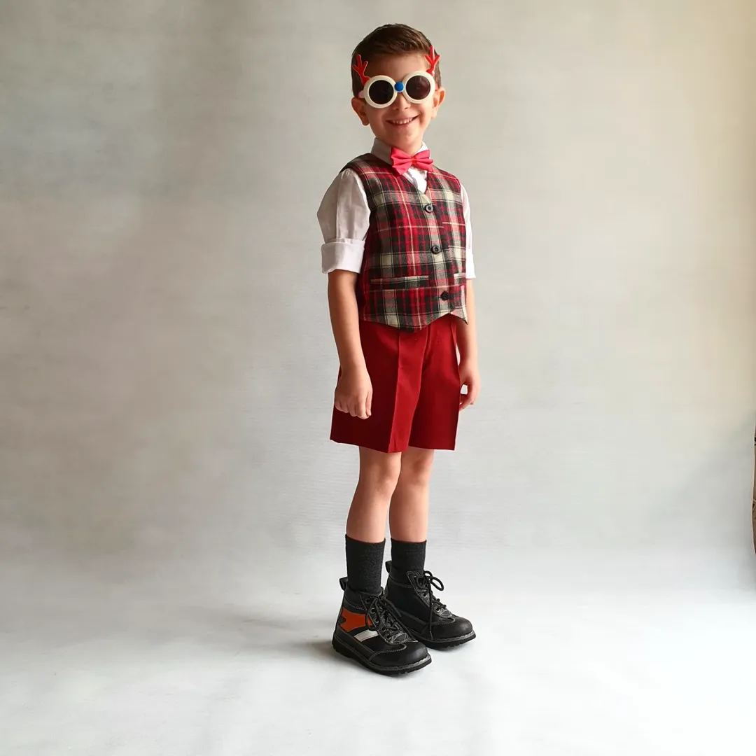 جلیقه و شلوارک کشمیر (پاییزه) بچه گانه مناسب یلدا و کریسمس، قابل سفارش با پارچه چهارخونه و قرمز ساده، از یک سال به بالا.